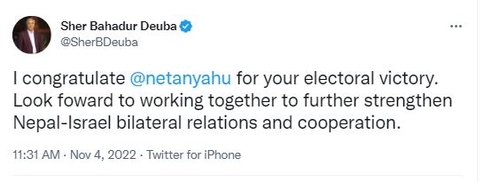 बधाई सन्देशमा प्रधानमन्त्री देउवाले दुई देशबीचको द्विपक्षीय सम्बन्ध र सहकार्यलाई थप मजबुत हुने आशा व्यक्त गरेका छन् । गठबन्धनका तर्फबाट नेतान्याहू पुनः प्रधानमन्त्रीमा निर्वाचित भएका हुन् ।