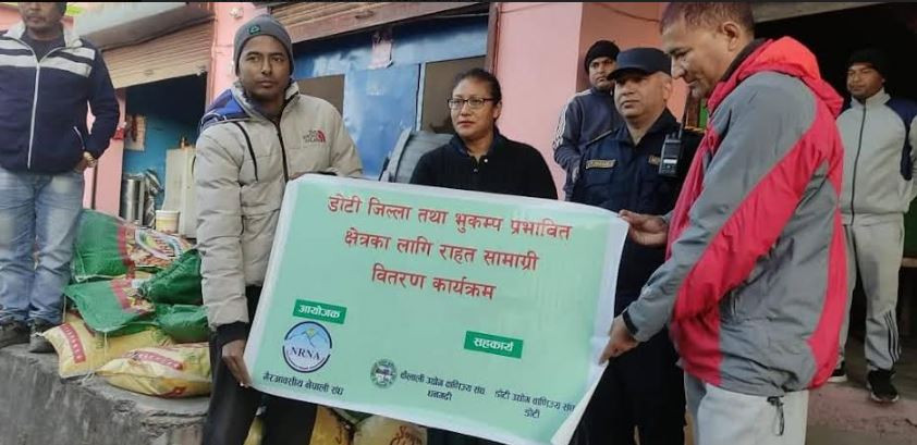 उक्त ठाउँमा भुकम्पमा परेर जनधनको क्षति भएपछि एनआरएनएले धनगढी उद्योग वाणिज्य संघ र डोटि उद्योग वाणिज्य संघ संगको समन्वयमा डोटीका प्रमुख जिल्ला अधिकारी, जिल्ला प्रहरी प्रमुख र नेपाल रेडक्रस सोसाईटी डोटी शाखाका प्रदेश महासचिवलाई राहात सामाग्री हस्तान्तरण गरेको हो ।