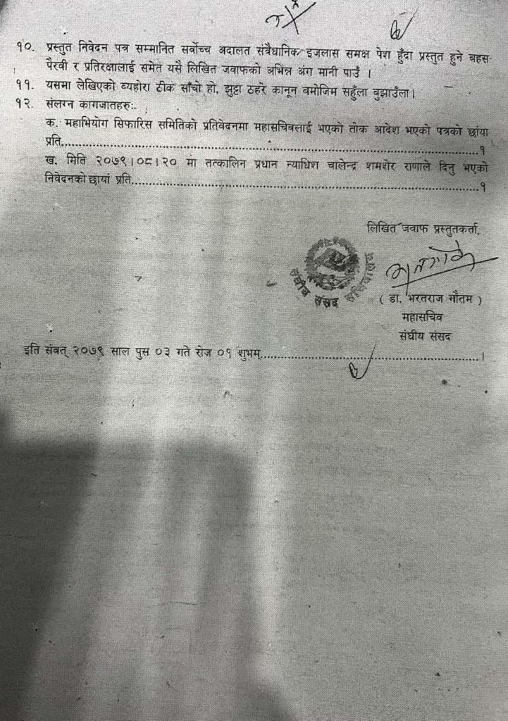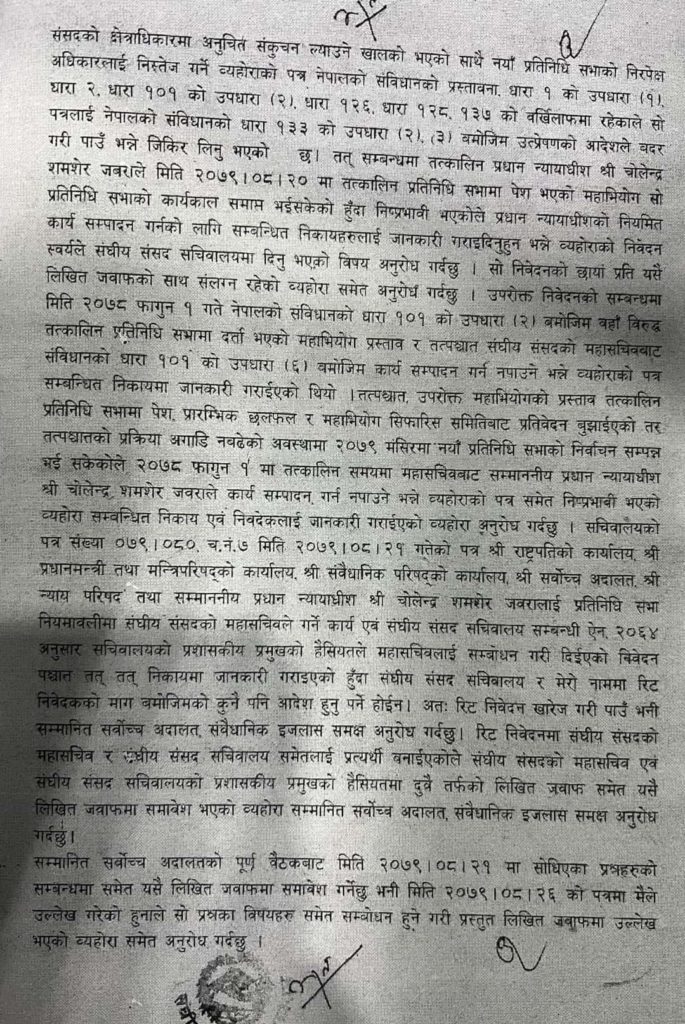 सर्वोच्च अदालतको संवैधानिक इजलासलाई दिएको जवाफमा उनले यस्तो बताएका हुन् । उनले महान्यायाधीवक्ताको कार्यालयमार्फत जवाफ पठाएका छन् ।