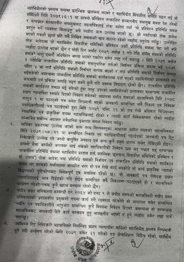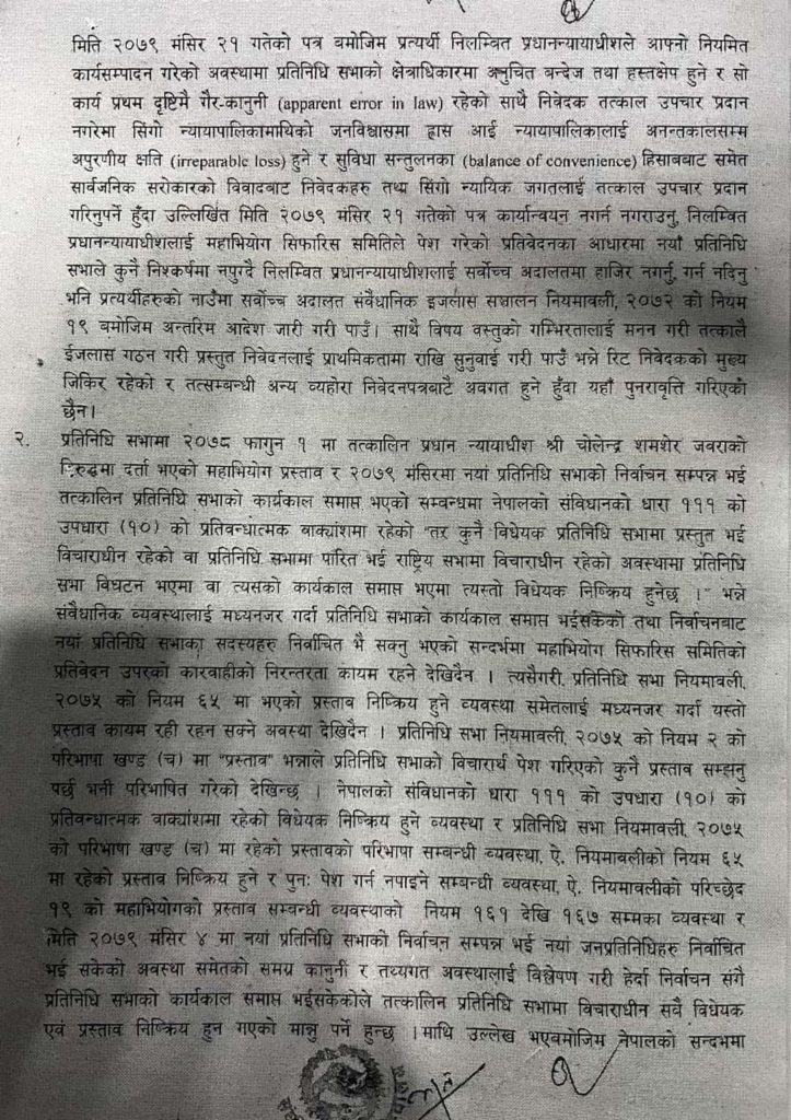 उनले प्रतिनिधिसभाको कार्यकाल समाप्त भएकोले प्रधानन्यायाधीश चोलेन्द्रशमशेर जबरामाथिको महाअभियोग निष्क्रिय रहेको भनी सम्बन्धित सबै निकायलाई जानकारी मात्रै गराएको बताए ।