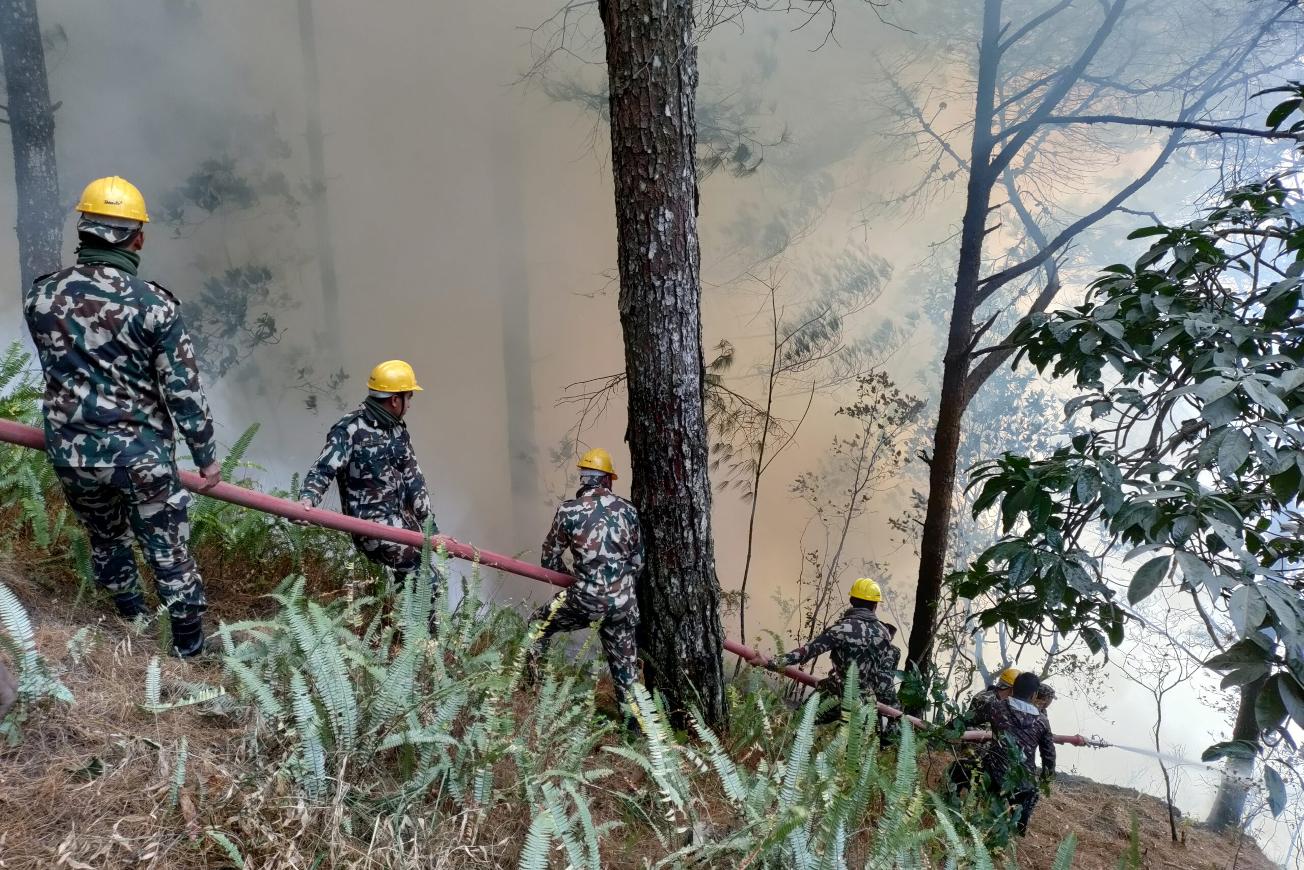 ताप्लेजुङ। ताप्लेजुङको सदरमुकाम फुङ्लिङस्थित कफी हाउस नजिकै नर्सरी जङ्गलमा लागेको आगो नियन्त्रणमा लिँदै सुरक्षाकर्मी । अहिले तीनवटै सुरक्षा निकाय र स्थानीयको सक्रियतामा आगो निभाउने प्रयास भइरहेको छ ।