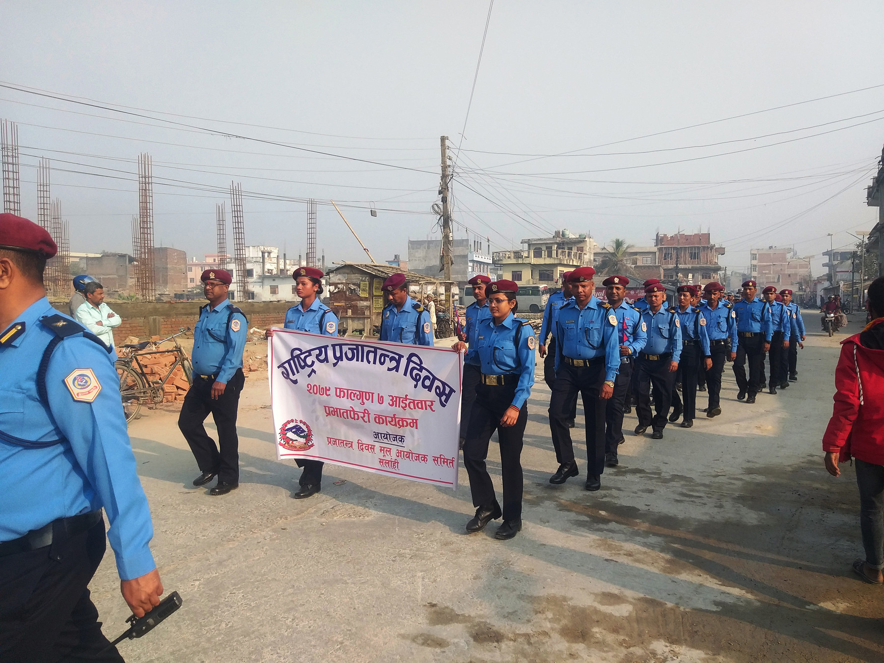 अत्तरिया । आज ७३औँ राष्ट्रिय प्रजातन्त्र दिवस सुदूरपश्चिम प्रदेशमा प्रभातफेरी आयोजना गरिएको छ । सुदूरपश्चिम प्रदेश मूल समारोह समितिको आयोजनामा धनगढी ट्राफिकचोकबाट आन्तरिक मामिला तथा कानुन मन्त्रालयसम्म प्रभातफेरी गरिएको हो ।