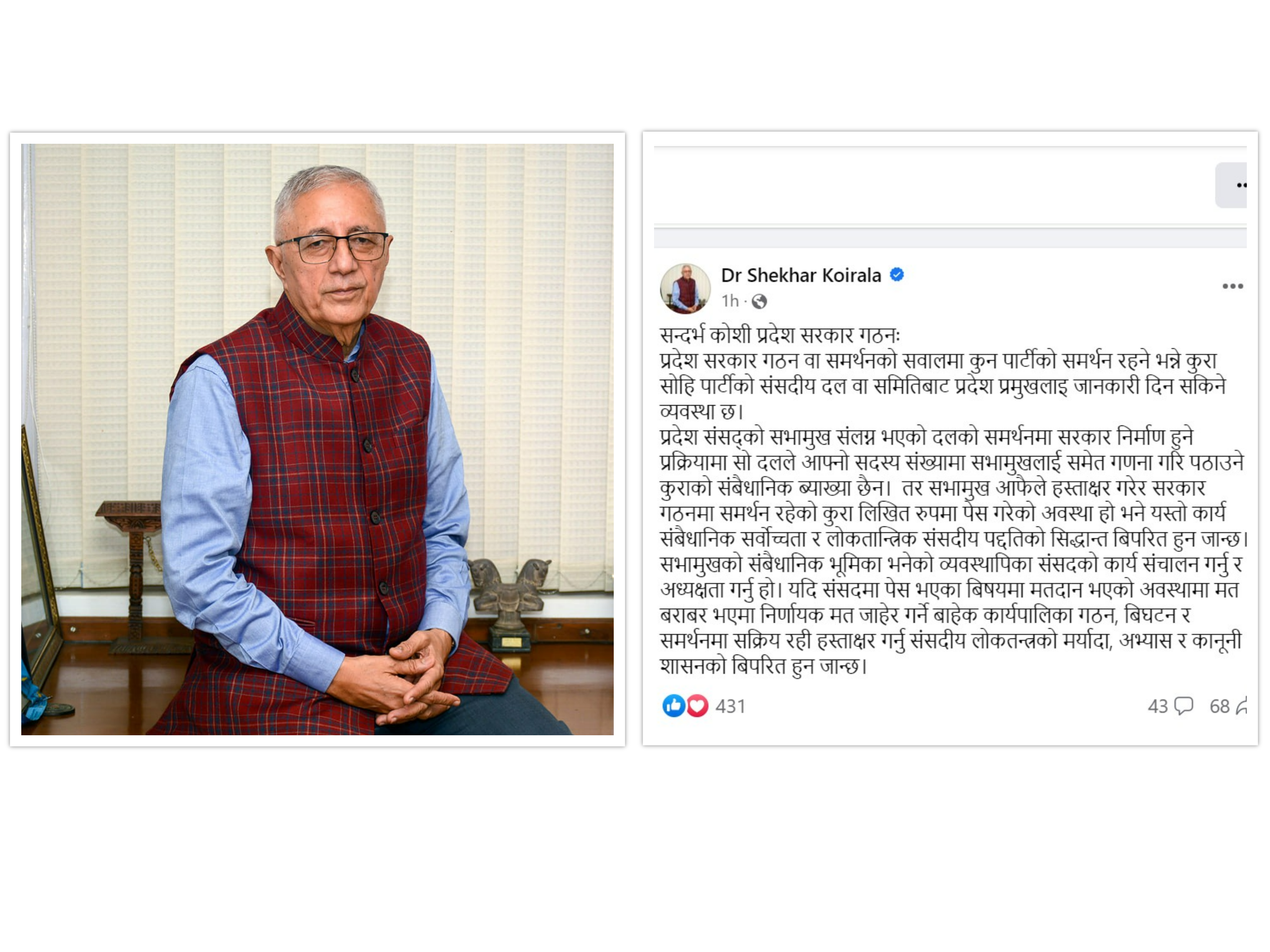 काठमाडौँ । नेपाली कांग्रेसका नेता डा. शेखर कोइरालाले सरकार गठनमा बहुमतका लागि सभामुखको समेत हस्ताक्षर गरी पठाएको विषय संविधानविपरीत भएको बताएका छन् ।