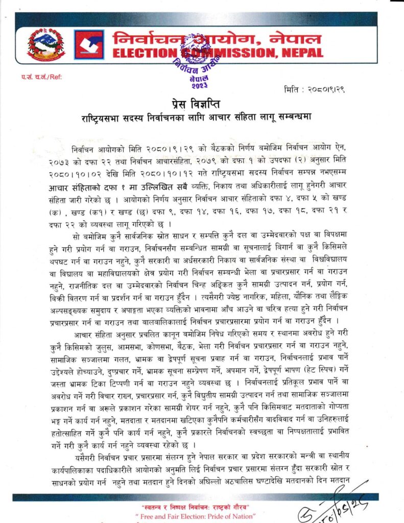 आचारसंहित माघ १२ गते अर्थात् राष्ट्रियसभा निर्वाचन सम्पन्न नभएसम्म लागु हुनेछ ।