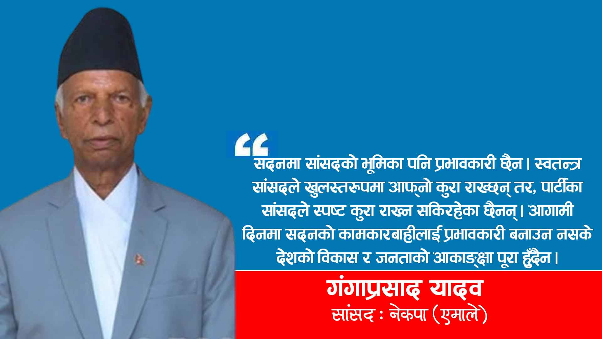 जनप्रतिनिधिको हैसियतले सदनमा संसद्को काम बारबाहीलाई पारदर्शी र प्रभावकारी बनाइनुपर्छ । जनताको शिक्षा, स्वास्थ्य, कृषिमा सुधार ल्याउने, गरिबी निवारण, रोजगारी सिर्जना, बेरोजगारीको अन्त्य गर्नेजस्ता कुरालाई सदनले प्राथमिकता दिनुपर्छ । जनतामा पनि चेतना, जागरण आउन जरुरी छ । मुख्य कमजोरी जनतामा पनि छ । जनताले चाह्यो भने परिवर्तन हुन्छ । एक दिन त देशमा परिवर्तन पक्कै हुन्छ ।