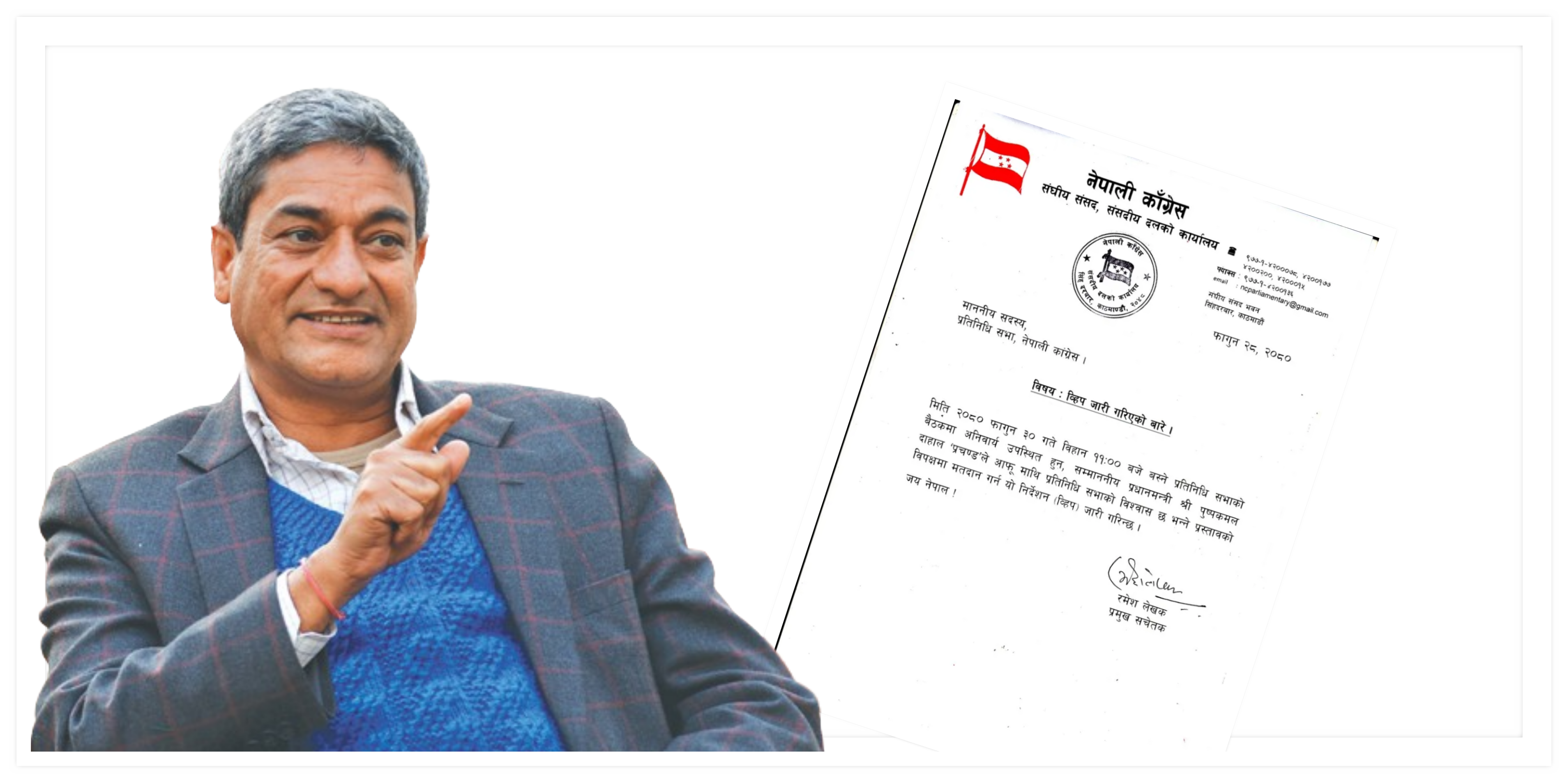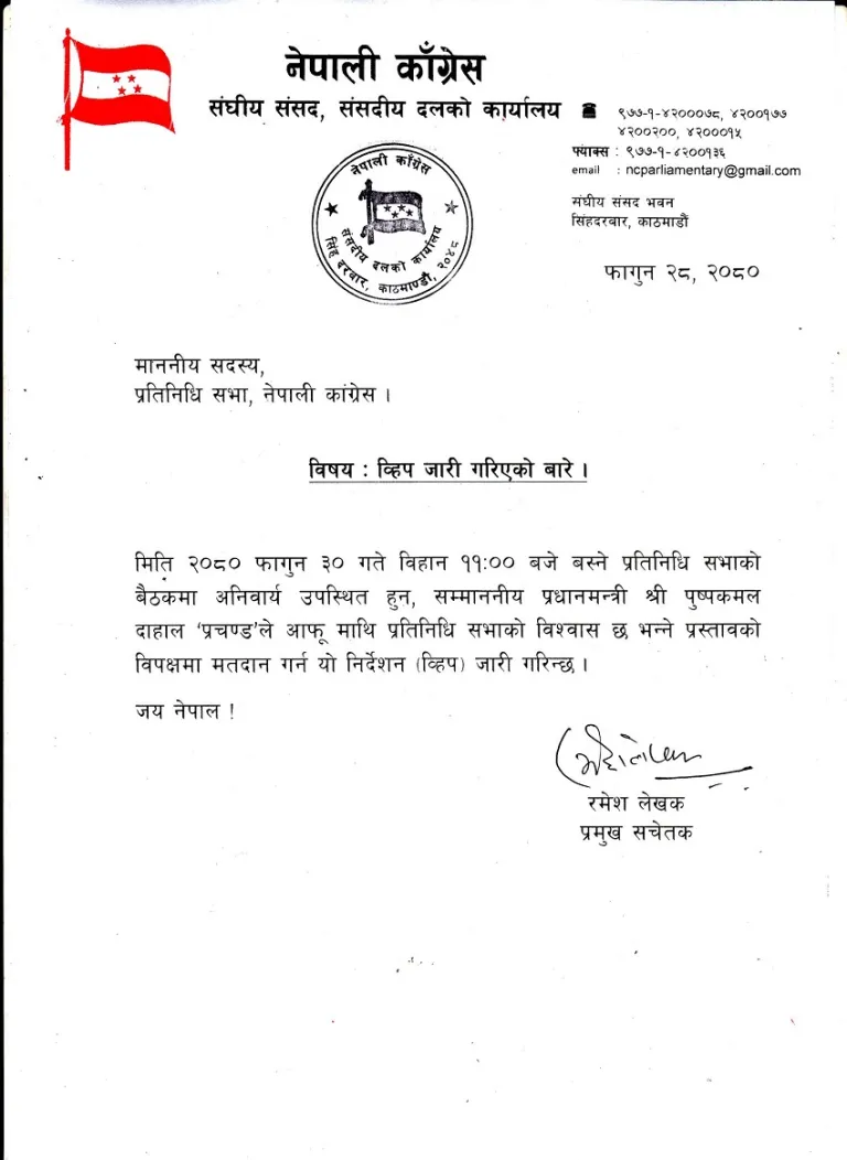 कांग्रेस प्रमुख सचेतक रमेश लेखकले आज एक विज्ञप्ति जारी गर्दै प्रतिनिधिसभाको फागुन ३० गते बस्ने बैठकमा अनिवार्य उपस्थित भइ प्रधानमन्त्री प्रचण्डले लिने विश्वासको मतको विपक्षमा मतदान गर्न ह्वीप जारी गरेका हुन् ।