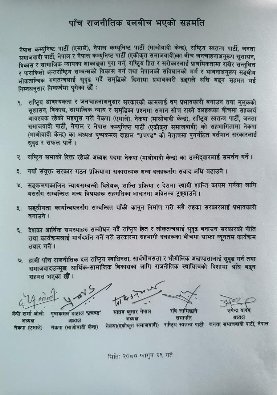 काठमाडाैँ । सत्ता गठबन्धनमा आवद्ध पाँच राजनीतिक दलबीच ७ बुँदे सहमति भएको छ ।
