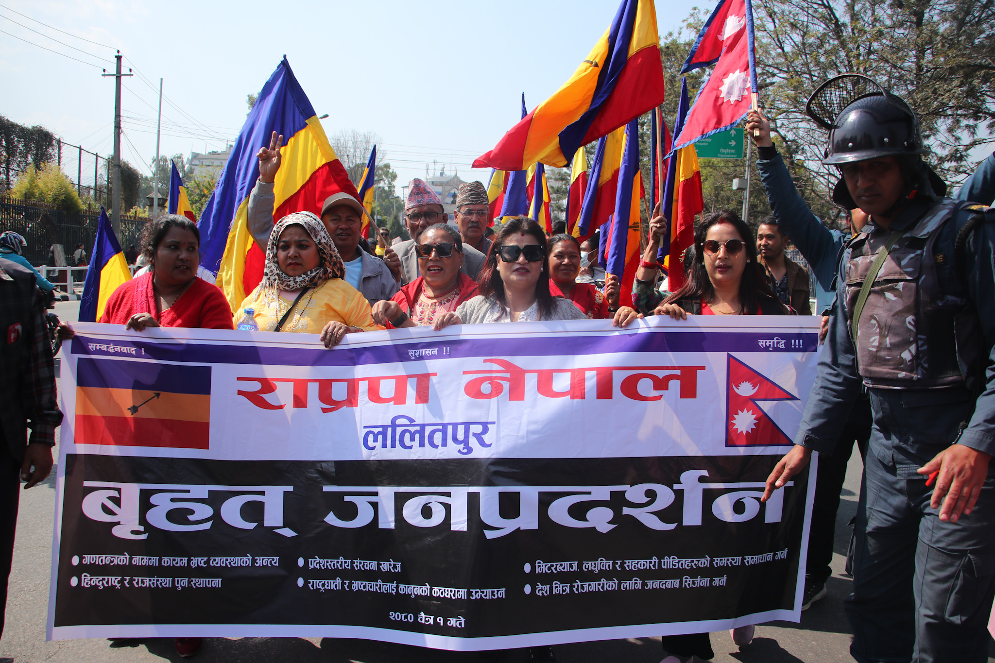 भ्रष्ट व्यवस्थाको अन्त्य, हिन्दु राष्ट्र र राजसंस्था पुनः स्थापना, प्रदेशस्तरीय संरचना खारेज, राष्ट्रघाती र भ्रष्टाचारीलाई कानुनको कठघरामा उभ्याउन मागसहित पार्टीले प्रदर्शन गरेको हो ।