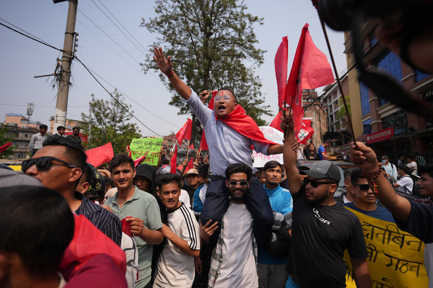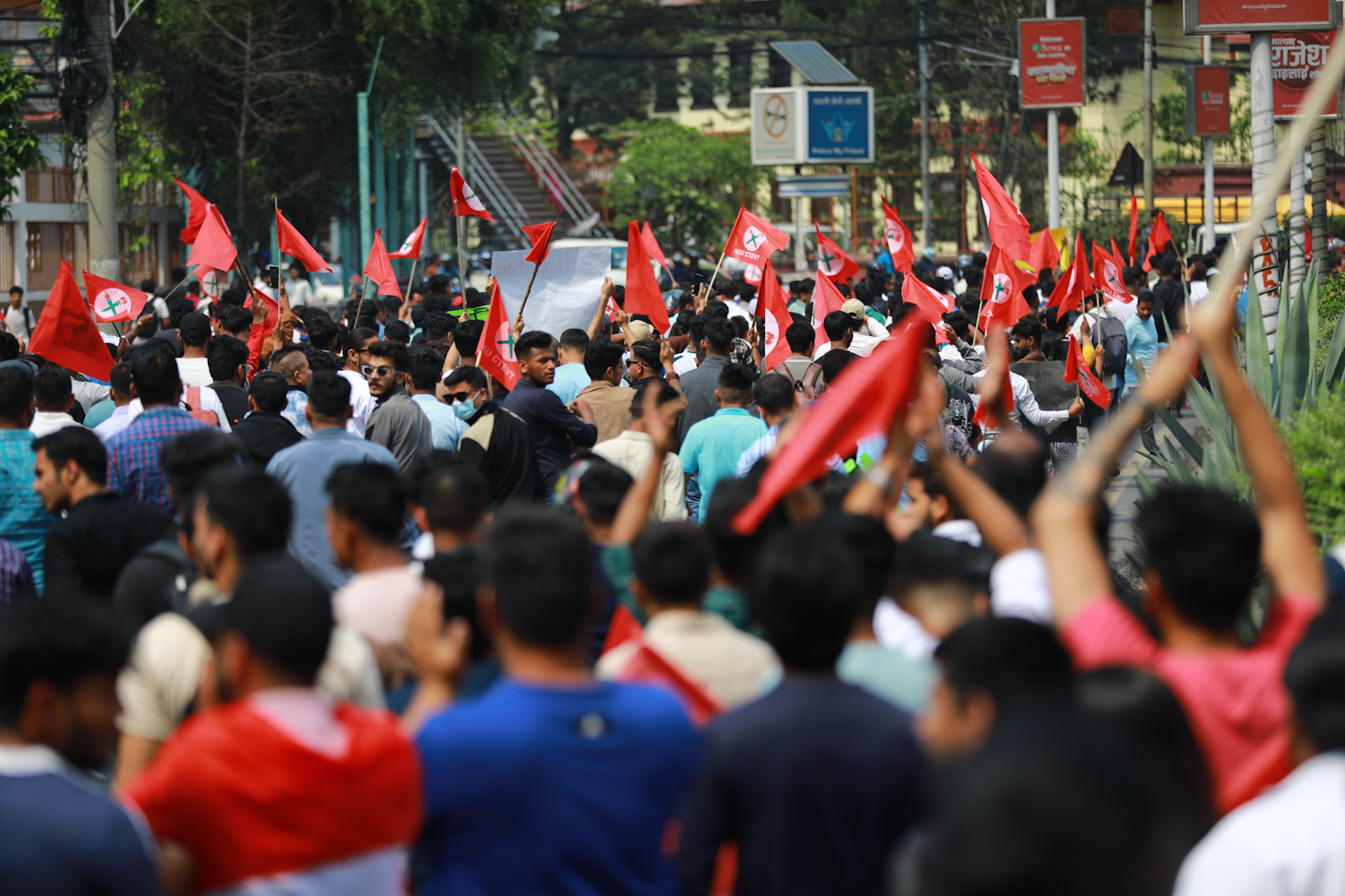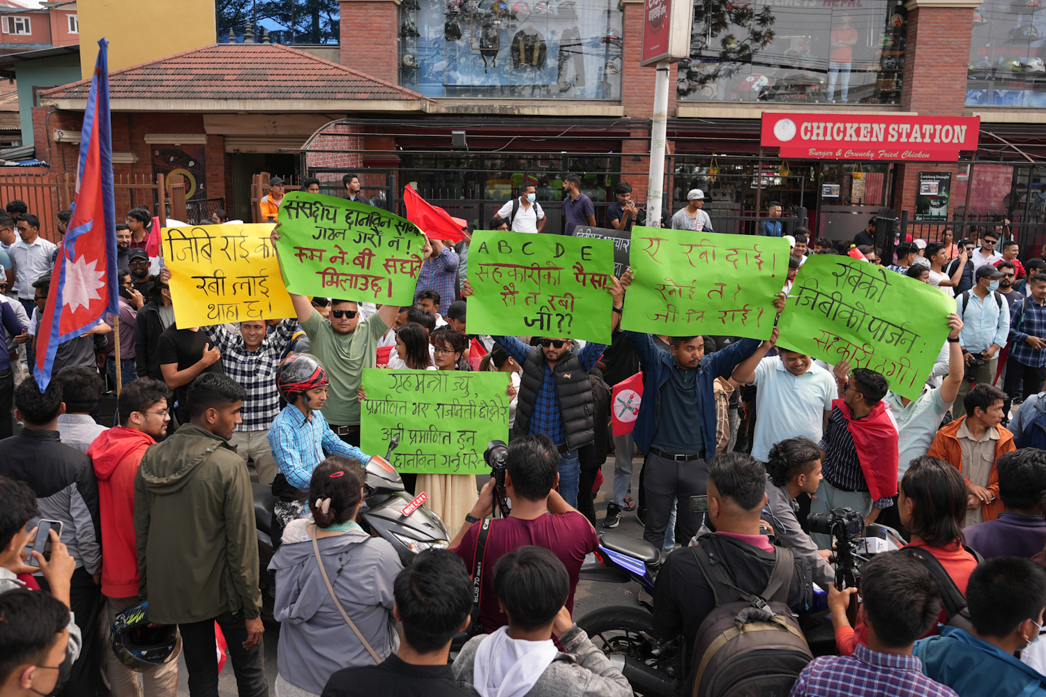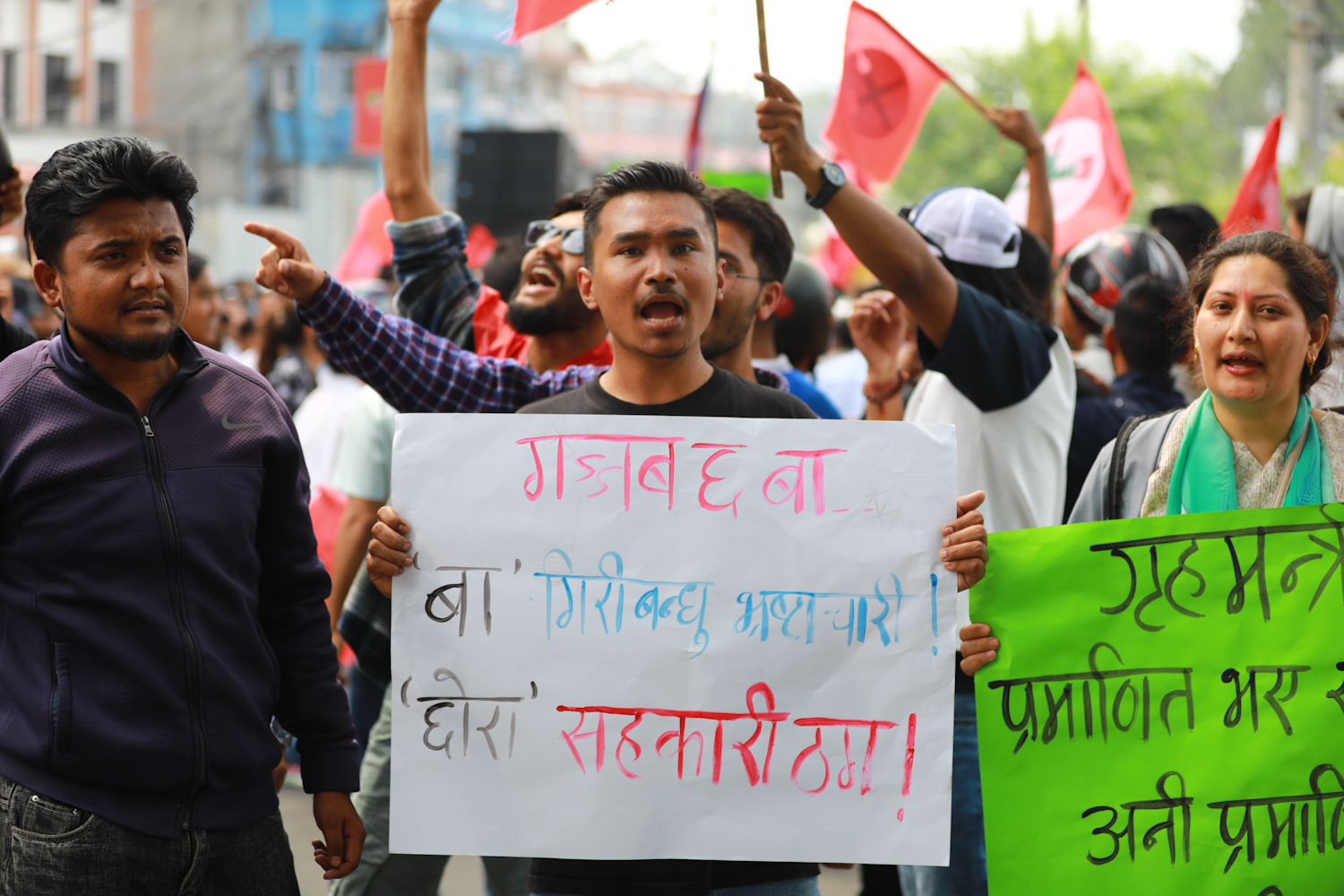 प्रदर्शनमा सहभागीहरूले चिया छानेको,सहकारी ठग जोगाउन जानेको,लुट्न सके लुट कान्छा,लुट्न सके लुट,अरु देशमा पाइदैन नेपालमै लुट,सहकारी ठगीको प्रमाण यहाँ छ,रवि दाइ अदालतले भन्यो- गिरिबन्धु,ओली सरकारको नीतिगत भ्रष्टाचार,कारवाही गर्ने हिम्मत छ ? लगायतका नारा लेखिएका प्लेकार्ड प्रदर्शन गरेका छन्।