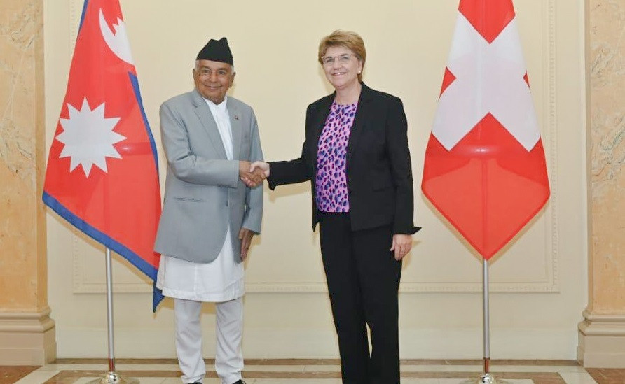 काठमाडौँ । राष्ट्रपति रामचन्द्र पौडेल र स्वीट्जरल्याण्डका राष्ट्रपति भियोला एमहर्डबीच स्वीट्जरल्याण्डको बर्नमा बुधबार भेटवार्ता भएको छ । स्वीट्जरल्याण्डको जेनेभामा भएको ११२ औँ अन्तर्राष्ट्रिय श्रम सम्मेलनको उच्चस्तरीय सत्रमा आयोजना गरिएको ‘सामाजिक न्यायका लागि विश्वव्यापी गठबन्धन’ को उद्घाटन सत्रमा मुख्य वक्ताका रुपमा सहभागी हुन गएका राष्ट्रपति पौडेल र स्वीट्जरल्याण्डका राष्ट्रपति एमहर्डबीच भेटवार्ता भएको हो ।