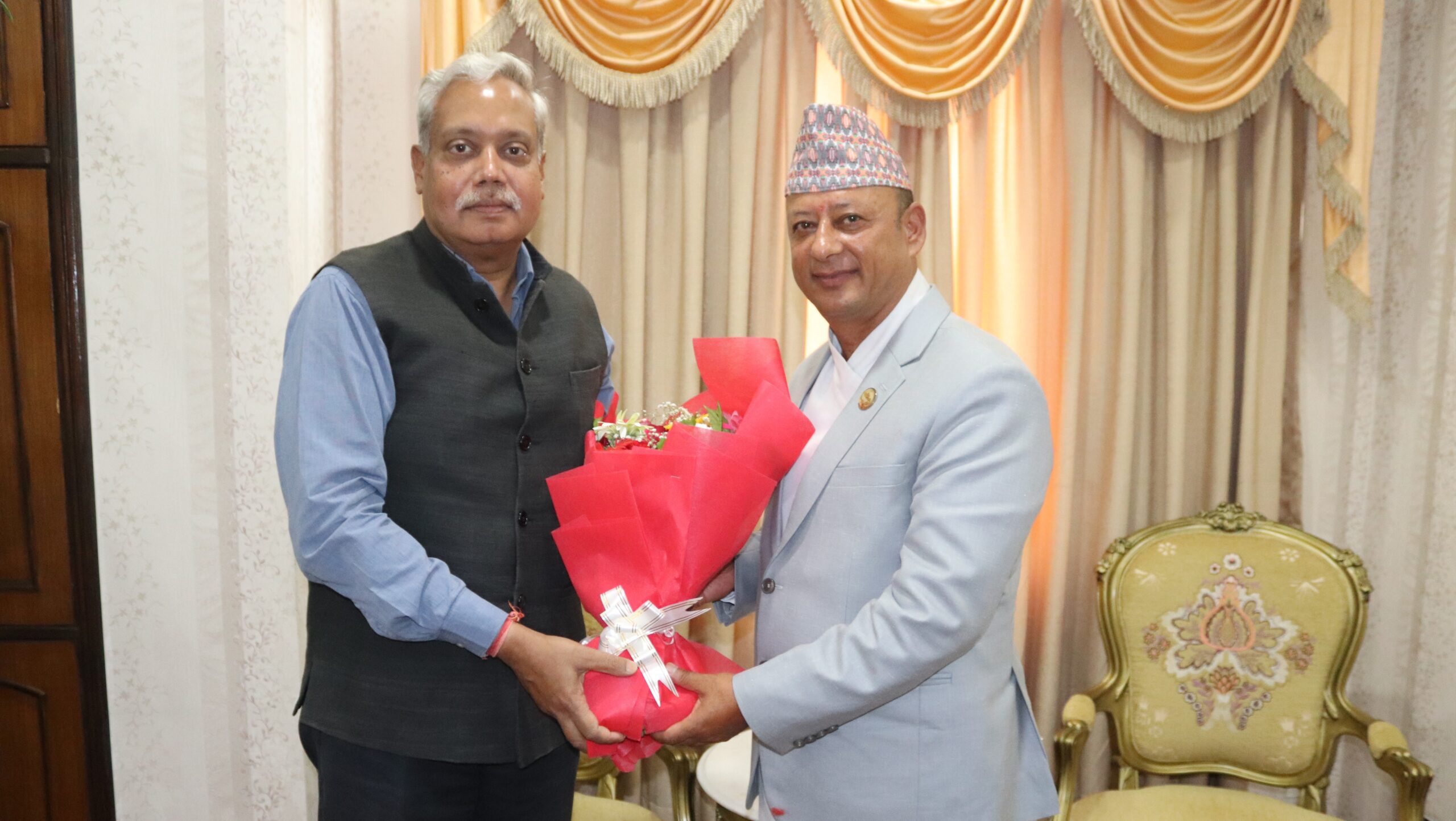 काठमाडौँ । ऊर्जा, जलस्रोत तथा सिँचाइमन्त्री दीपक खड्कासँग नेपालका लागि भारतीय राजदूत नवीन श्रीवास्तवले शिष्टाचार भेट गरेका छन् । सिंहदरबारस्थित ऊर्जा मन्त्रालयमा आज भएको भेटमा नेपाल–भारत ऊर्जा सहकार्यका विषयमा विविध छलफल भएको मन्त्रालयले जनाएको छ ।
