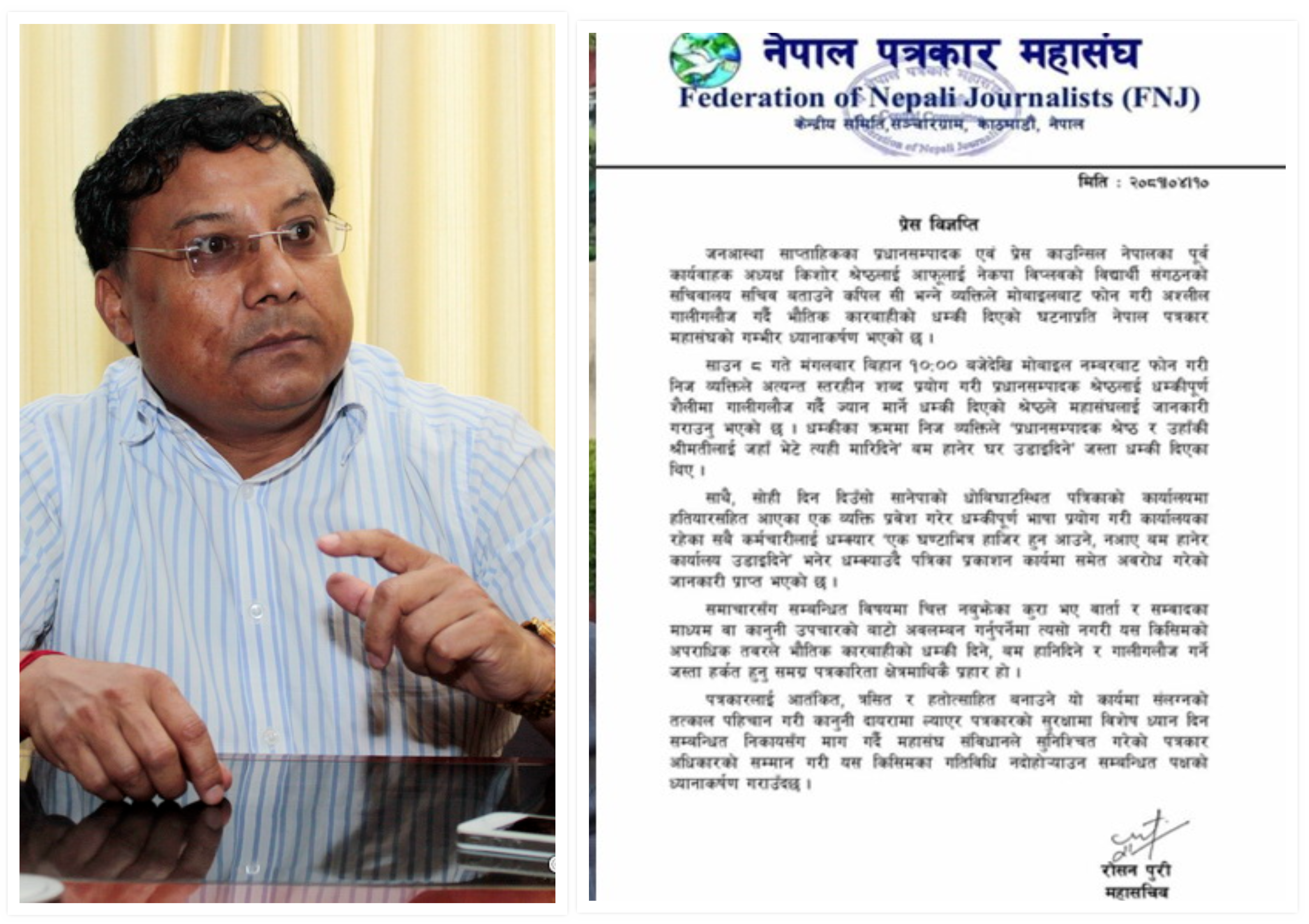 नेपाल पत्रकार महासंघका अनुसार साउन ८ गते मंगलबार बिहान सीले मोबाइलबाट फोन गरी प्रधानसम्पादक श्रेष्ठलाई धम्कीपूर्ण शैलीमा गालीगलौज गर्दै ज्यान मार्ने धम्की दिएको श्रेष्ठले महासंघलाई जानकारी गराएका छन् । धम्कीका क्रममा निज व्यक्तिले ‘प्रधानसम्पादक श्रेष्ठ र उनकी श्रीमतीलाई जहाँ भेटे त्यही मारिदिने’ बम हानेर घर उडाइदिने’ जस्ता धम्की दिएको महासंघको भनाई छ ।