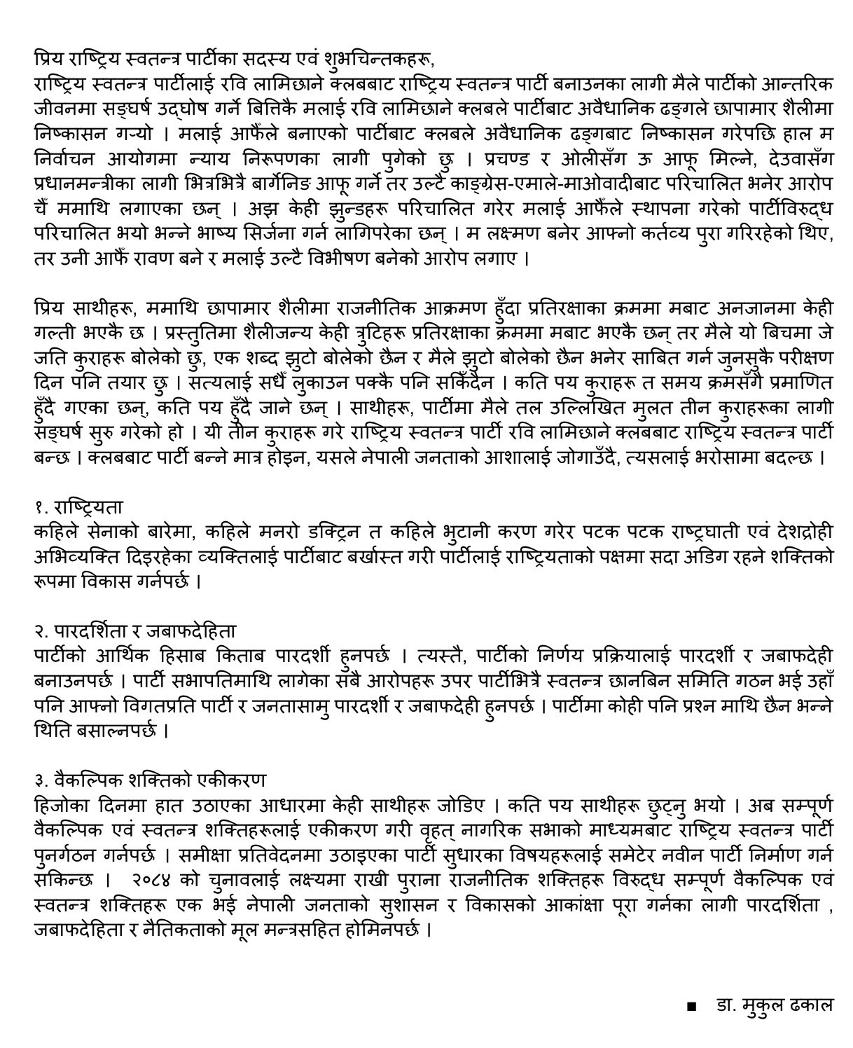राष्ट्रिय स्वतन्त्र पार्टीलाई रवि लामिछाने क्लबबाट मुक्त बनाउन आफूले पार्टीको आन्तरिक जीवनमा सङ्घर्ष उद्घोष गर्नेबित्तिकै पार्टीबाट अवैधानिक ढङ्गले छापामार शैलीमा निष्कासन गरिएको बताएका छन् ।