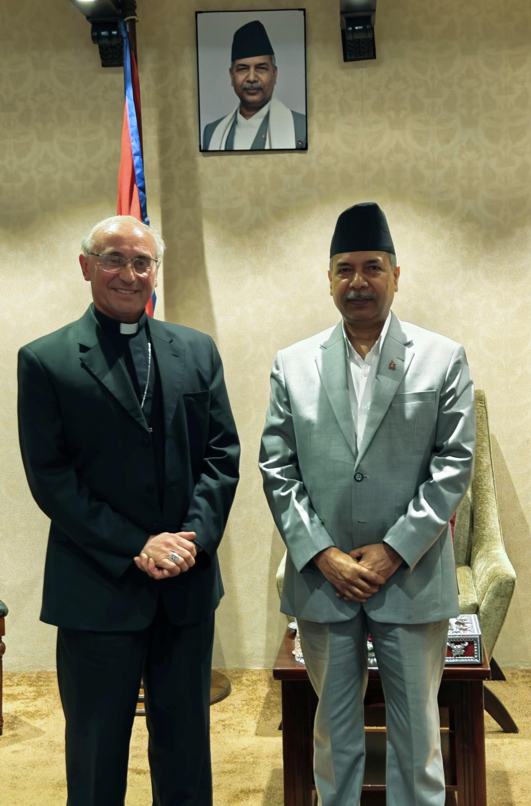 काठमाडौँ । उपराष्ट्रपति रामसहायप्रसाद यादवसँग नेपालका लागि होली सीरभेटिकन सिटीका राजदूत आर्कबिशप लियोपोल्डो जिरेलीले लैनचौरस्थित उपराष्ट्रपतिको कार्यालयमा आज शिष्टाचार भेट गरेका छन् । भेटमा शुभकामना आदानप्रदानपश्चात नेपाल र होली सीबीचको द्विपक्षीय सम्बन्धका विविध आयामबारे छलफल भएको उपराष्ट्रपतिको कार्यालयद्वारा आज जारी विज्ञप्ती उल्लेख छ ।