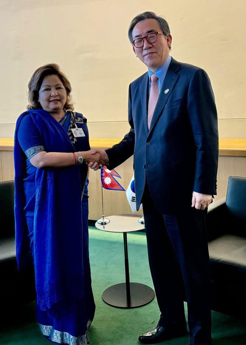 काठमाडौँ । संयुक्त राष्ट्रसङ्घको ७९ औँ महासभामा सहभागी हुने क्रममा न्युयोर्कमा रहेकी परराष्ट्रमन्त्री डा आरजु राणा देउवाले मङ्गलबार दक्षिण कोरिया र फिलिपिन्सका विदेशमन्त्रीसँग छुट्टाछुट्टै भेटवार्ता गरेका छन् ।