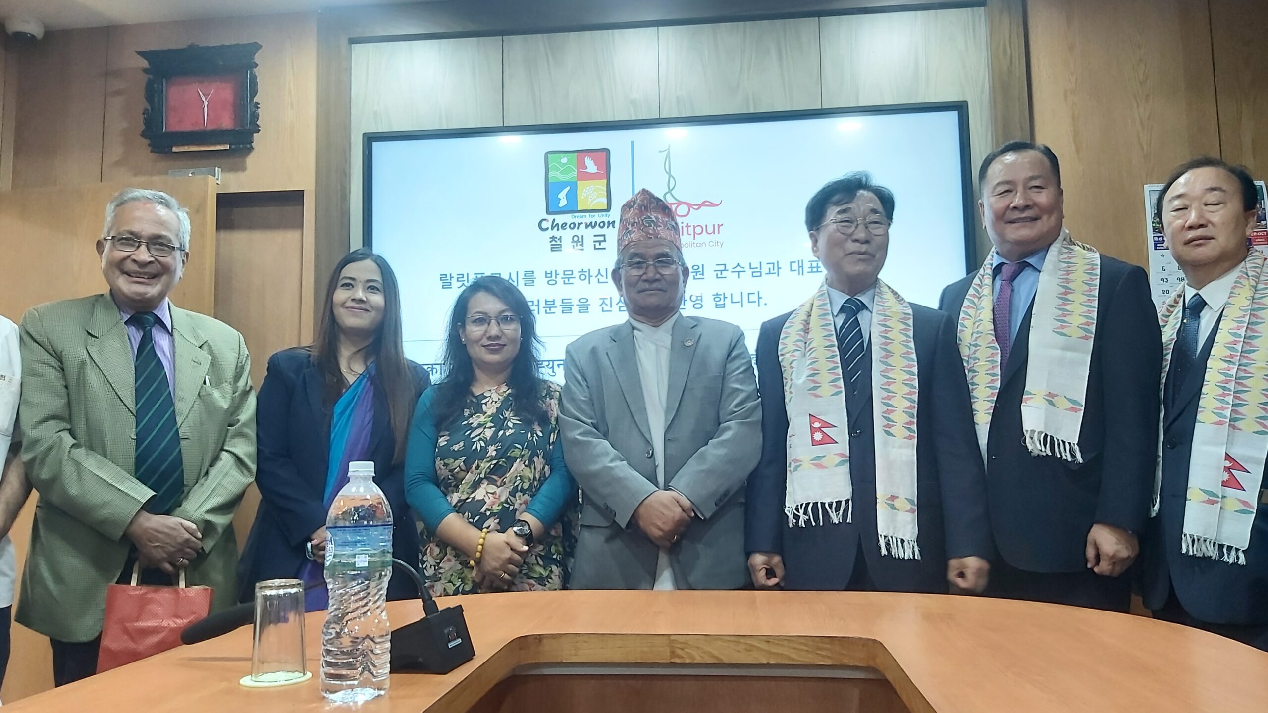 कोरियाको चेरवन सहरका प्रमुख ली ह्युन जोनसहितको प्रतिनिधिमण्डलको स्वागतमा ललितपुर महानगरपालिकाको बैठक कक्षमा आज आयोजित कार्यक्रममा नगरप्रमुख चिरीबाबु महर्जनले वातावरण र कृषि क्षेत्रमा भएका सकारात्मक अभ्यास आदानप्रदान गर्न चाहना व्यक्त गरे ।