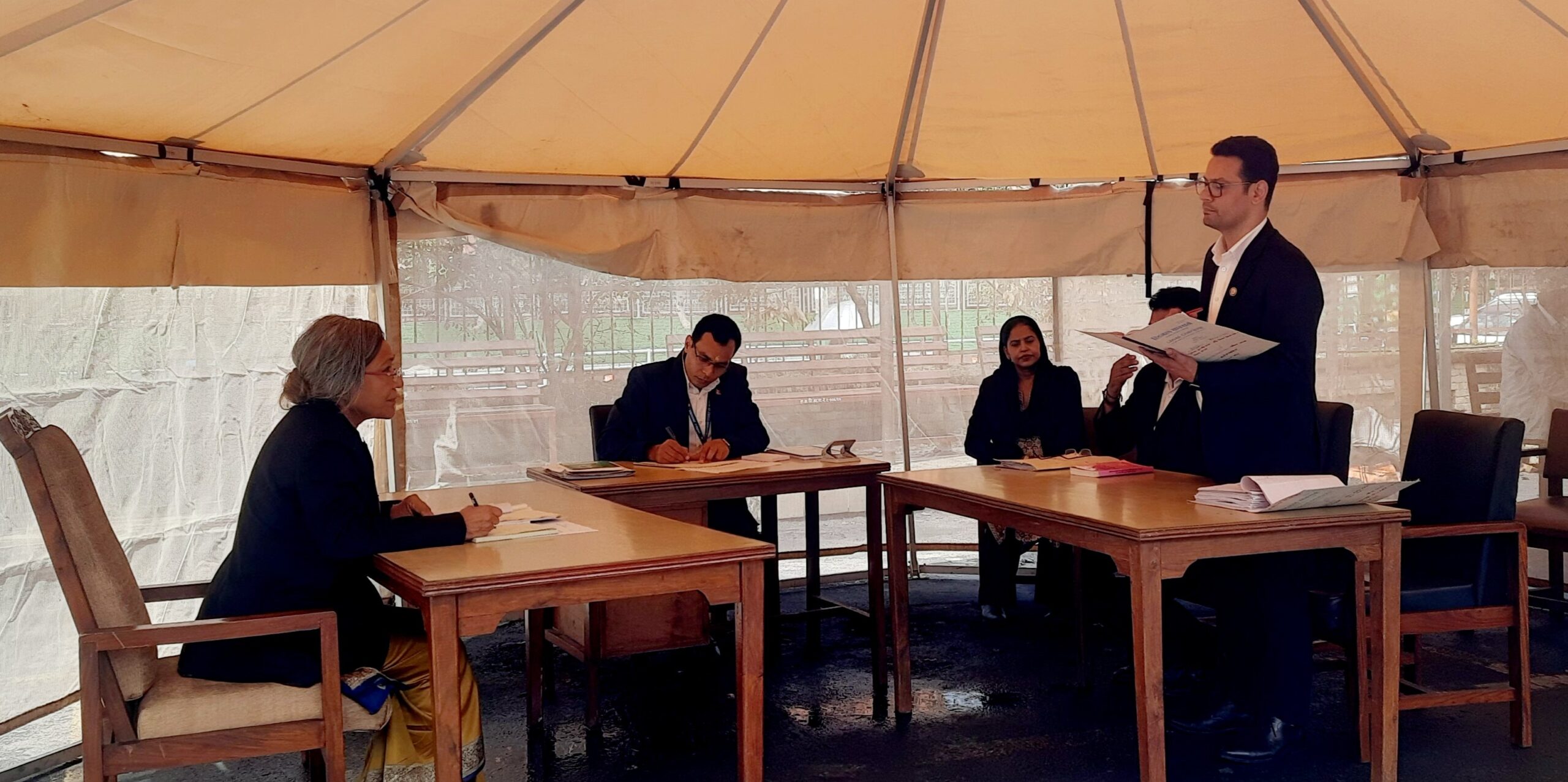 कर्मचारी बस्ने ठाउँ छैन । धेरै कर्मचारीको मुहार अझै खुल्न सकेको छैन । असरल्ल जलेको गाडीकै अगाडि एक छेउमा पाल टाँगिएको छ । पालमुनि काठका टेबल कुर्सी राखेर एकातर्फ न्यायाधीश र अर्को तर्फ कानुन व्यवसायी, अनि बिचमा इजलास अधिकृत बस्ने व्यवस्था गरी आजदेखि इजलास सञ्चालन गरिएको छ ।