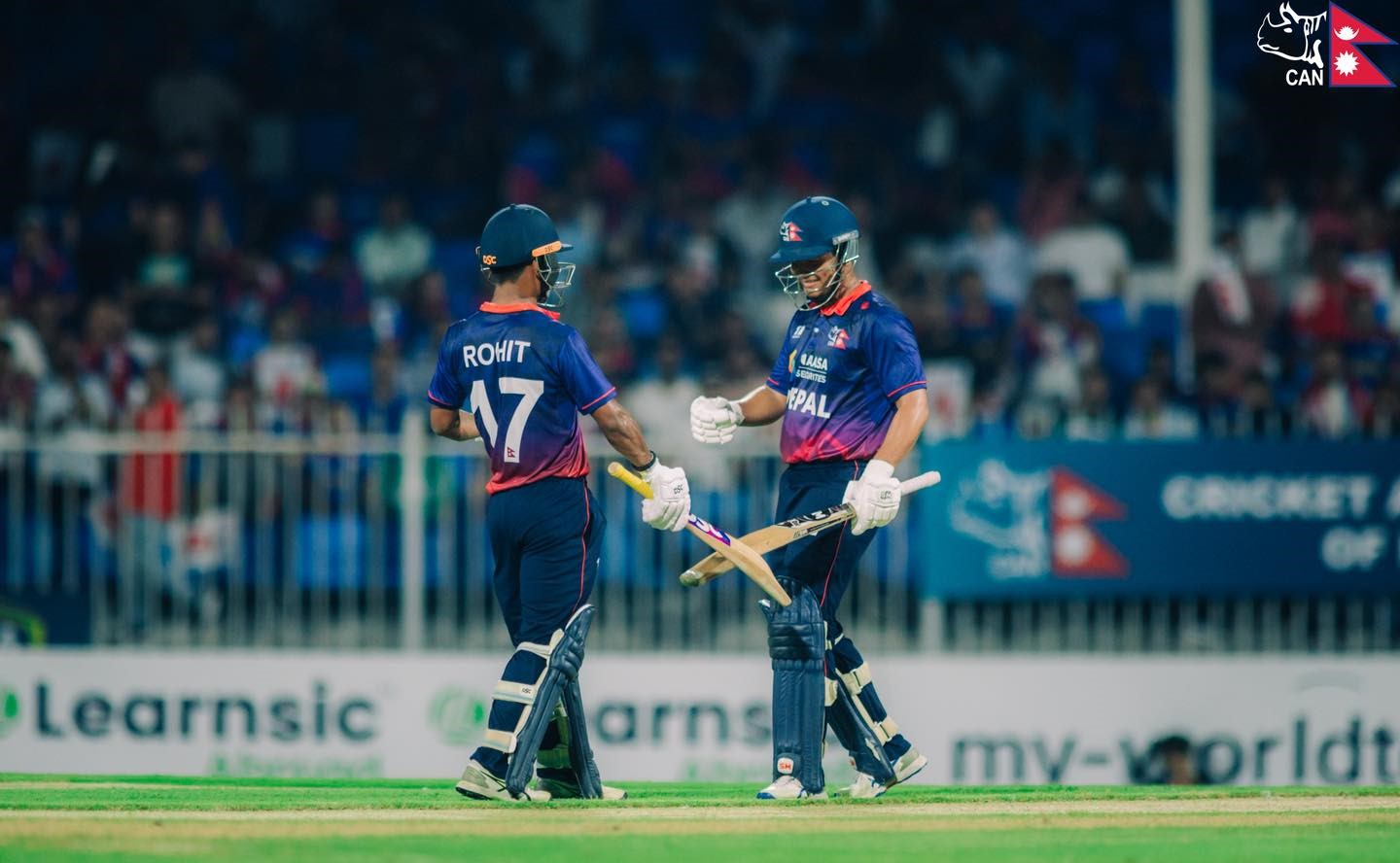 नेपालका लागि कप्तान रोहित पौडेलले सर्वाधिक ३८ रनको योगफल बनाए । उनले ३५ बलमा तीन चौका र एक छक्कासहित सर्वाधिक ३८ रन बनाएका हुन् । त्यस्तै कुशल मल्लले २१ बलमा दुई चौका र दुई छक्कासहित ३० रन बनाए । गुल्शन झाले २२ रन बनाए भने दीपेन्द्रसिंह ऐरीले १७ रन बनाए ।