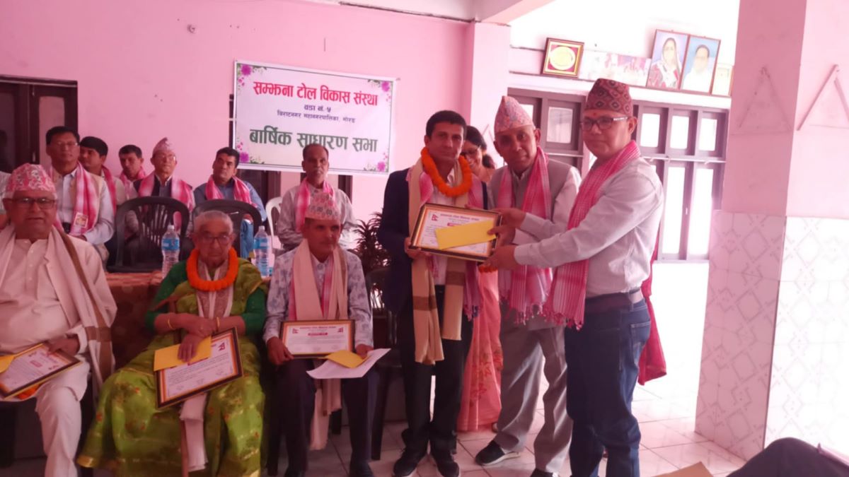 विराटनगर । विराटनगर महानगरपालिका–५, सम्झना टोल विकास संस्थाको २६औं वार्षिक साधारणसभा भव्य रूपमा सम्पन्न भएको छ । साधारणसभाको अवसरमा वरिष्ठ पत्रकार केशव भट्टराईलाई नगद ११ हजार १ सय ११ रुपैयाँ र सम्मानपत्रसहित सम्मान गरिएको छ ।