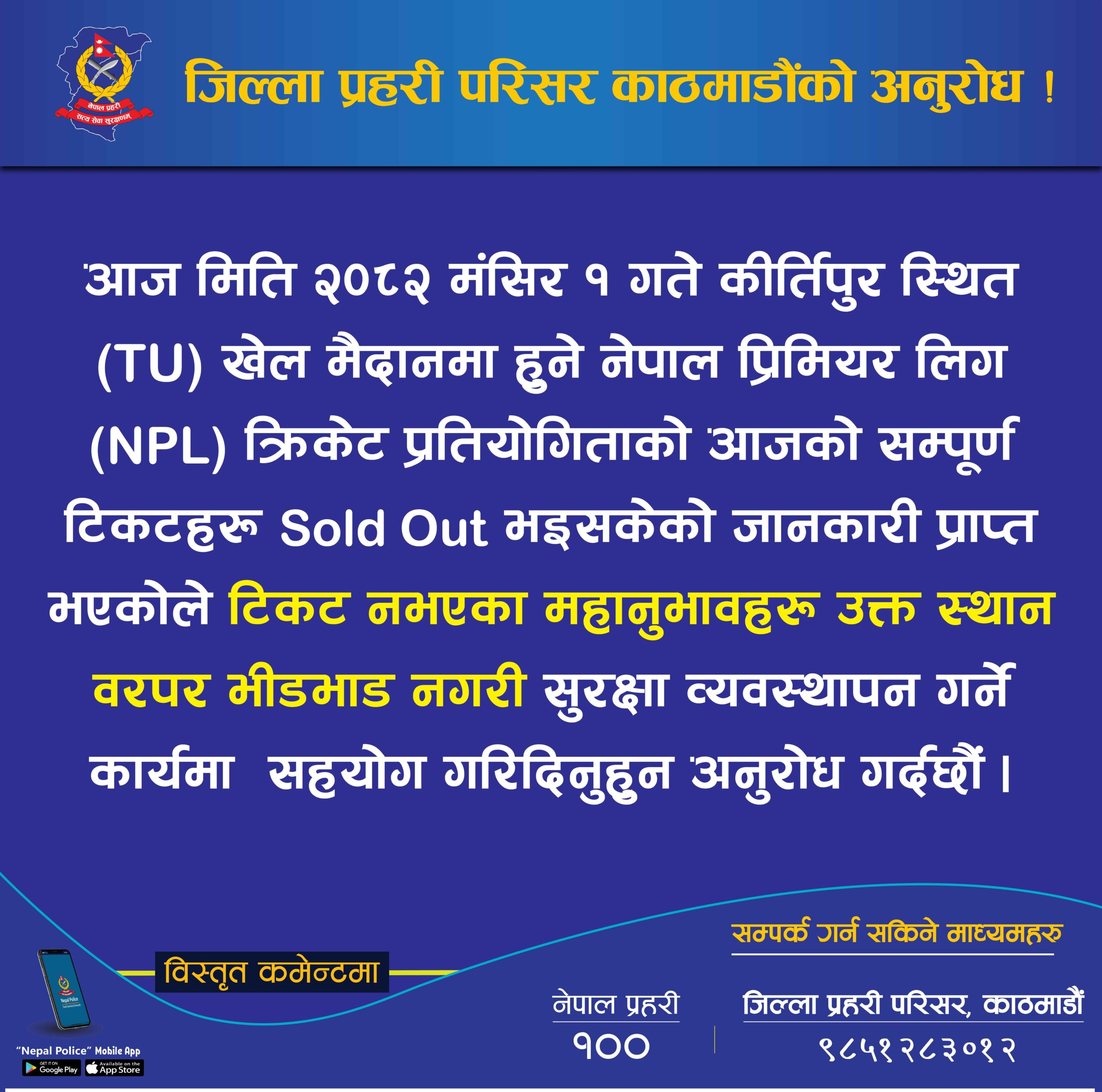 जारी सूचनामा भनिएको छ, “मिति २०८२ मंसिर १ गते कीर्तिपुरस्थित टीयू खेल मैदानमा हुने नेपाल प्रिमियर लिग (एनपीएल) क्रिकेट प्रतियोगिताको आजको सम्पूर्ण टिकट सोल्ड आउट भएपछि टिकट नभएका महानुभावहरूले मैदान परिसर वरपर भीड नगरी सुरक्षामा सहयोग गर्न अनुरोध गरिन्छ।”