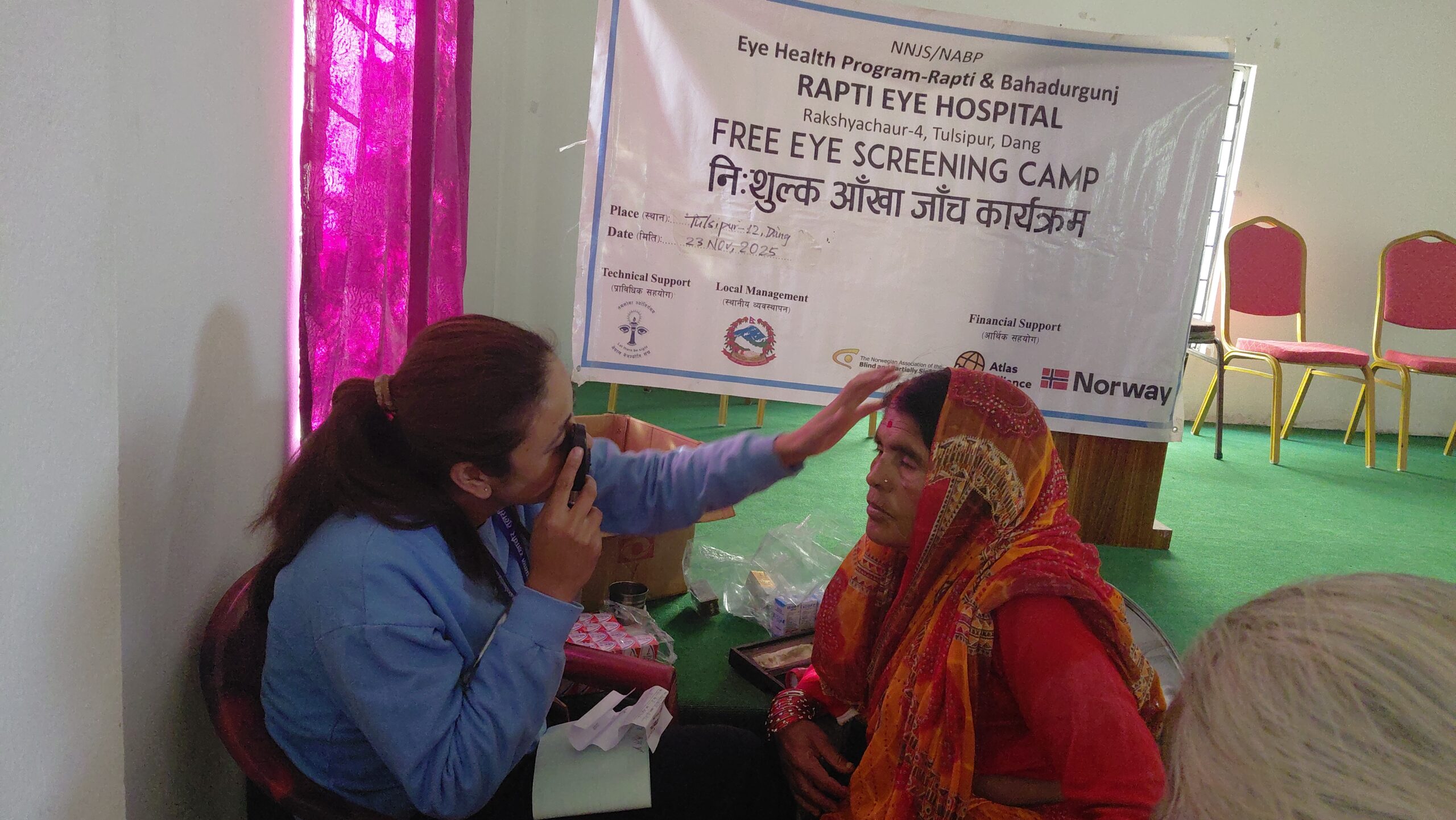 त्यस्तै तुलसीपुर १२ कै ८२ वर्षीय चेतनाथ पोख्रेलको पनि आँखा परीक्षण गर्दा मोतिविन्दु देखियो । नेपाल नेत्रज्योति सङ्घद्वारा सञ्चालित राप्ती आँखा अस्पतालले एनएबिपी नर्वेको आर्थिक एवं प्राविधिक सहयोग आयोजित निःशुल्क आँखा जाँच शिविर आयोजना गरिएको थियो ।
